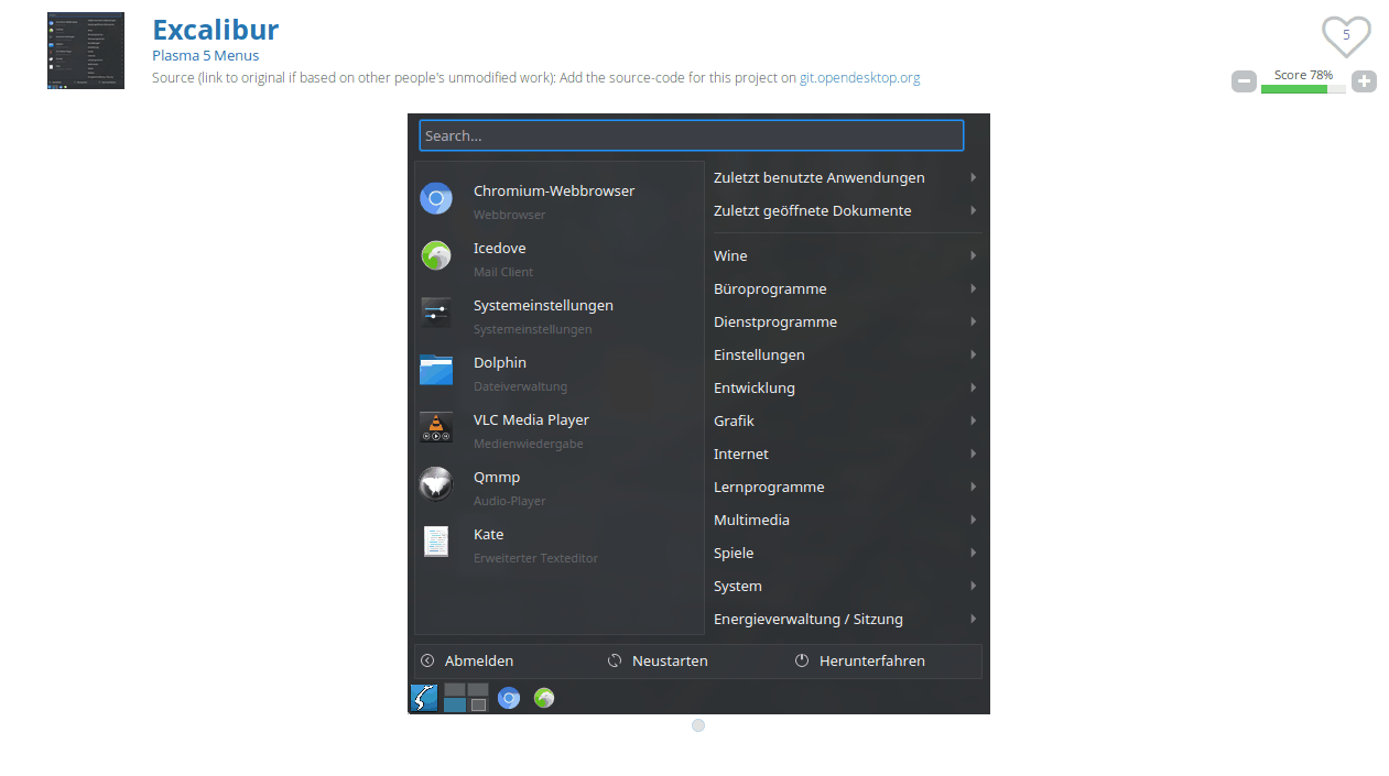 Excalibur — это система меню, альтернативная стандартной системе запуска KickOff для KDE Plasma 5. В ней есть столбец избранного слева и меню просмотра приложений справа, и она основана на меню Lancelot для KDE 4.