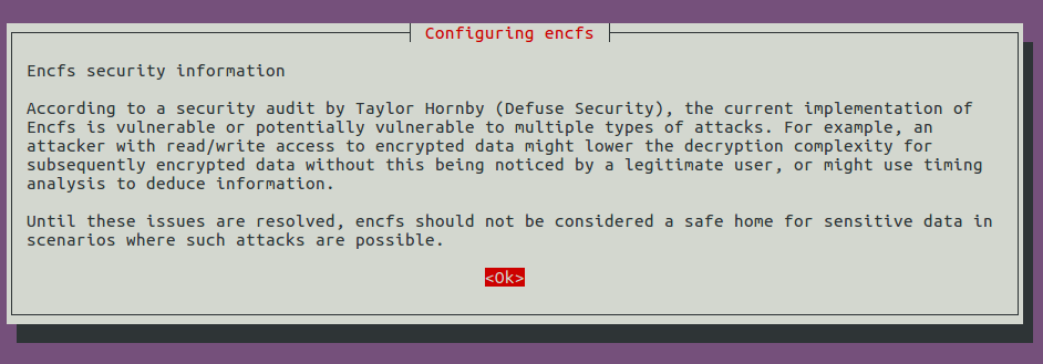 During the installation, a prompt tells you that the current implementation of is vulnerable and should not be used. Press to continue.