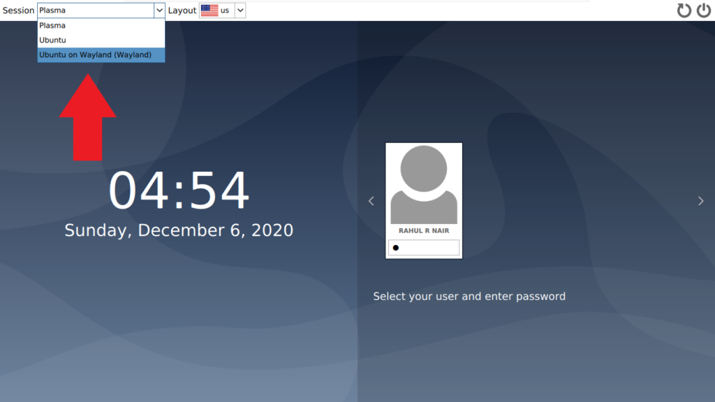 На экране Login Рабочего стола Kubuntu выберите Настольную Сессию как Плазму и войдите в систему с Вашими существующими учетными данными Ubuntu.