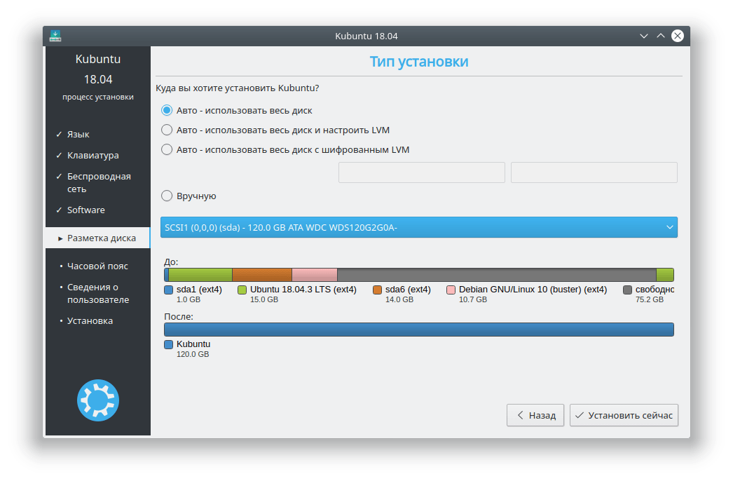 Шаг разметки диска является самым ответственным. Если вы устанавливаете Kubuntu на целый жесткий диск, то можно довериться автоматической разметке и выбрать пункт Авто — использовать весь диск.