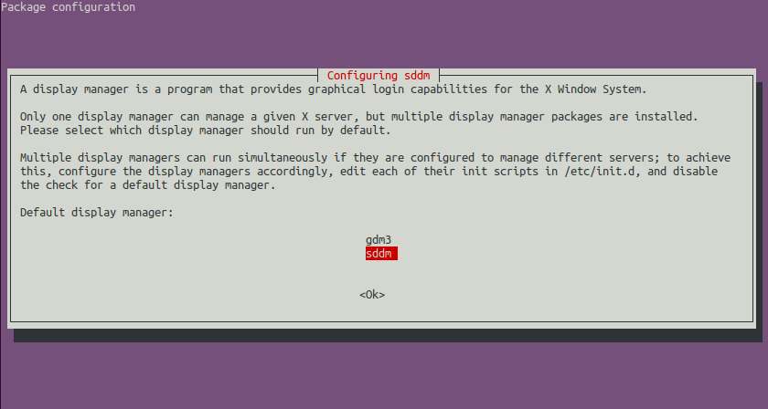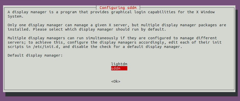 Here, you have to select a default display manager for Ubuntu. If you want to use KDE’s display manager, then choose SDDM (Simple Desktop Display Manager).