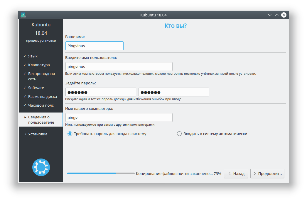 Введите данные о пользователе и задайте пароль пользователя. Имя пользователя будет использоваться, как имя вашей домашней директории.