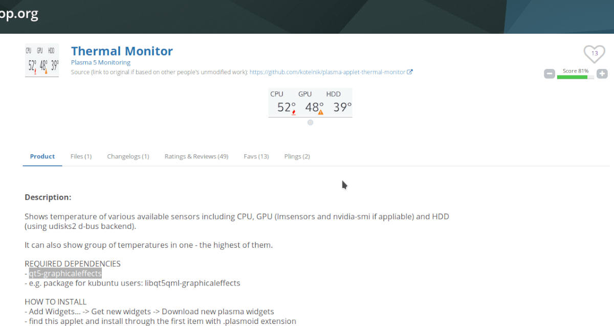 Примечание: вместе с установкой файла плазмоида Thermal Monitor вы должны установить пакет qt5-graphicaleffects на свой компьютер с Linux.
