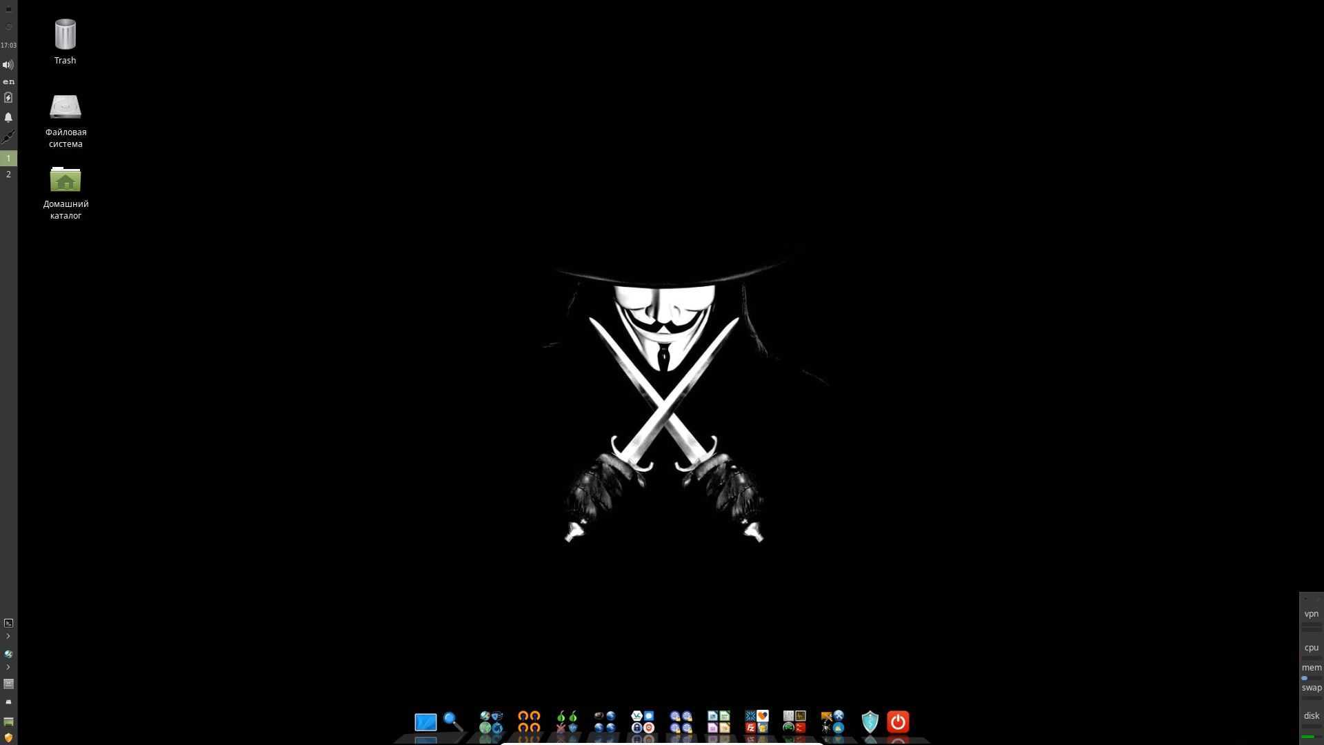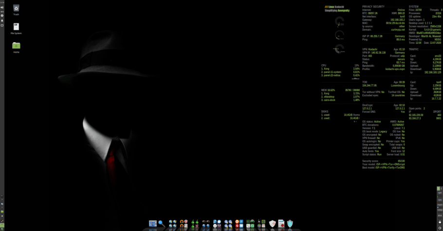 Сразу после загрузки нас встречает рабочий стол. Довольно необычно и оригинально оформленный, с системным монитором Conky, который показывает какие средства анонимности задействованы и результат их работы, ну и показывает данные о системе, сетевую активность и задействованные ресурсы. Все это очень удобно и совсем не лишнее. Но если вдруг захочется что-то подредактировать под себя, то конфиг Conky лежит в папке /etc/conky/.