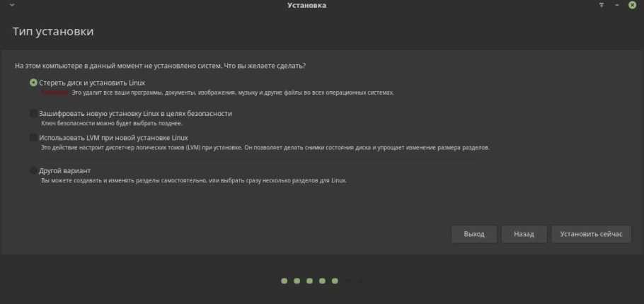 В разделе тип установки выбираем «Стереть диск и установить Linux», и в продолжение «Установить сейчас».