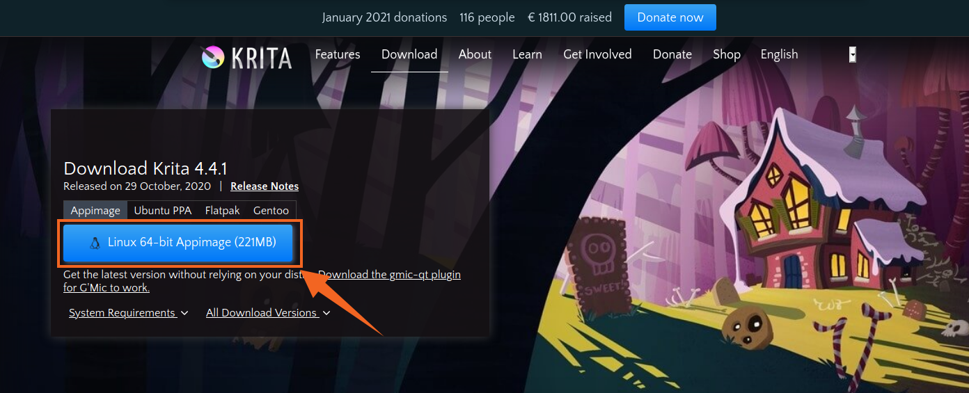 And click on the “Linux 64 bit AppImage” button to download the AppImage file of Krita, as shown in the picture above.