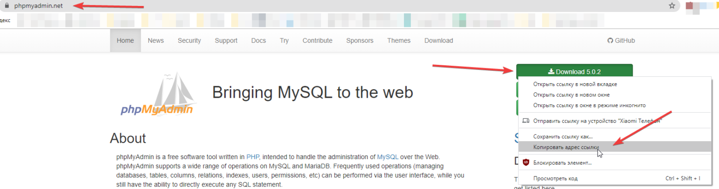Для удобного менеджмента базой данных, нам нужно установить phpMyAdmin. Перехордим на phpmyadmin.net, правой кнопкой жмем на ссылку скачивания и копируем адрес ссылки: