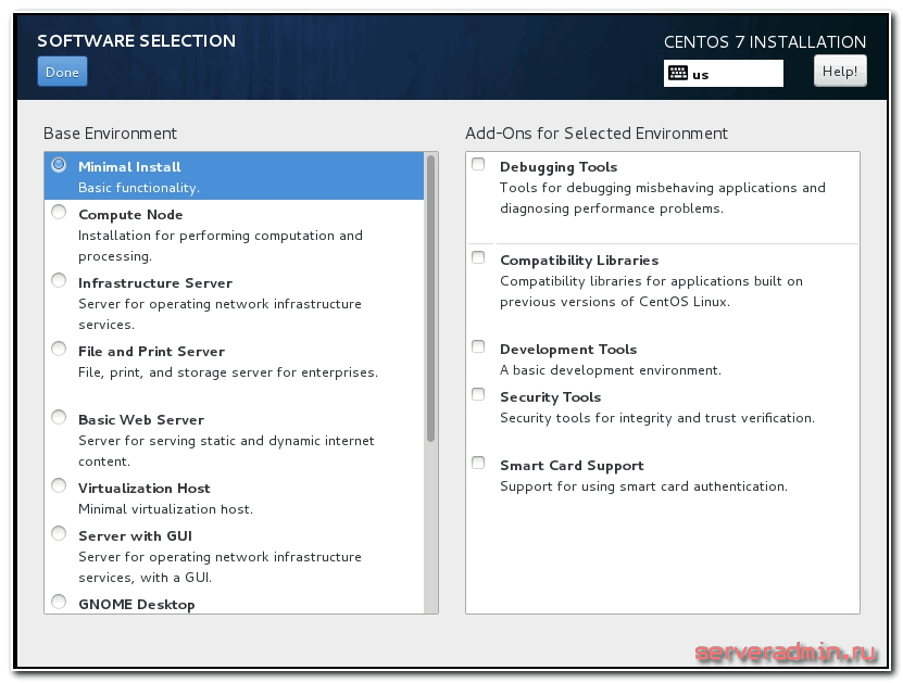 Указываем путь и жмем Done. После проверки доступности источника, в разделе SOFTWARE SELECTION можно выбрать необходимый для установки набор софта: