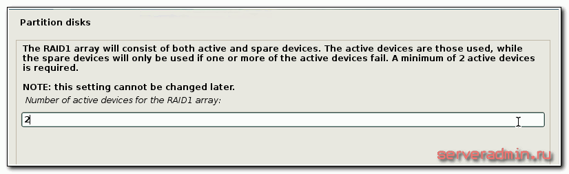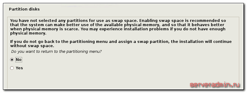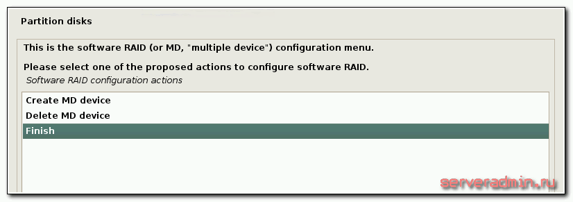 На этом завершаем создание рейда и разметку диска и переходим дальше к установке debian, как было описано выше. Никаких принципиальных изменений больше не будет. Единственное, будет задан вопрос о том, что вы не создали раздел swap и будет предложено вернуться и исправить это.