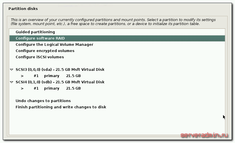 То есть мы на каждом диске создаем по одному пустому разделу, без точки монтирования и файловой системы. Эти пустые разделы мы объединим в raid и там уже сделаем корень системы — . Для swap я не создаю отдельный раздел, чтобы не делать потом отдельный raid для него. Swap сделаем в виде файла после установки системы. Итак, создаем рейд — Configure Software raid. Соглашаемся с предложением сохранить изменения.