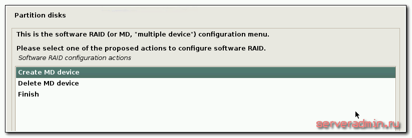 Выбираем Create MD device, затем RAID1.