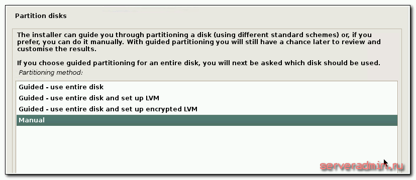 Итак, начинаем установку системы по приведенной ранее инструкции. Доходим до этапа разбивки диска и выбираем режим Manual.