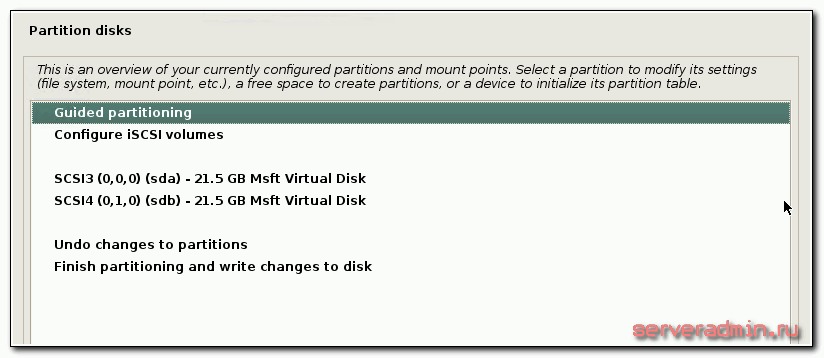 Выбираем режим Guided partitioning и настраиваем разделы на дисках, чтобы получилась такая картинка.