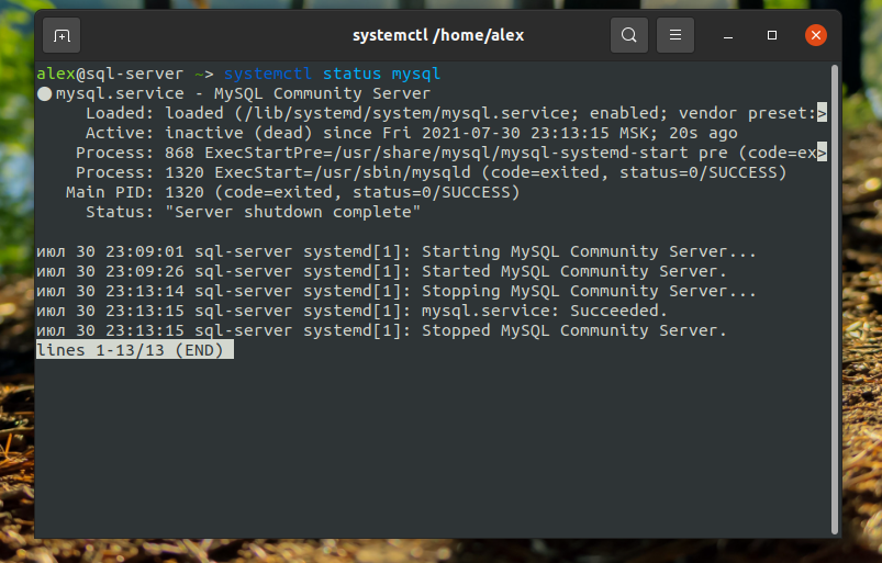 В разделе Active должно быть active (running). Те же самые действия необходимо сделать для проверки MySQL: