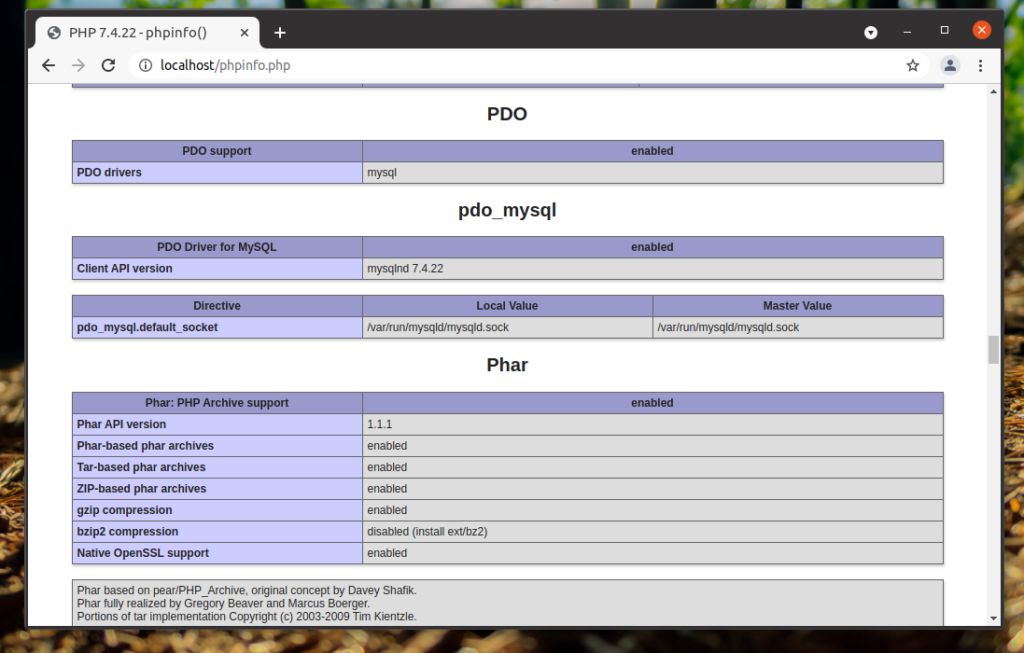 Далее откройте адрес localhost/phpinfo.php в браузере. Если всё работает, вы должны увидеть страничку, которая изображена ниже на скриншоте: