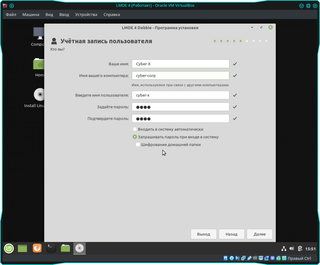 На следующем экране нам нужно заполнить данные, а именно, ваше имя, имя компьютера и пароли. Тут все индивидуально, так же можете поставить галочку для автоматического входа в систему: