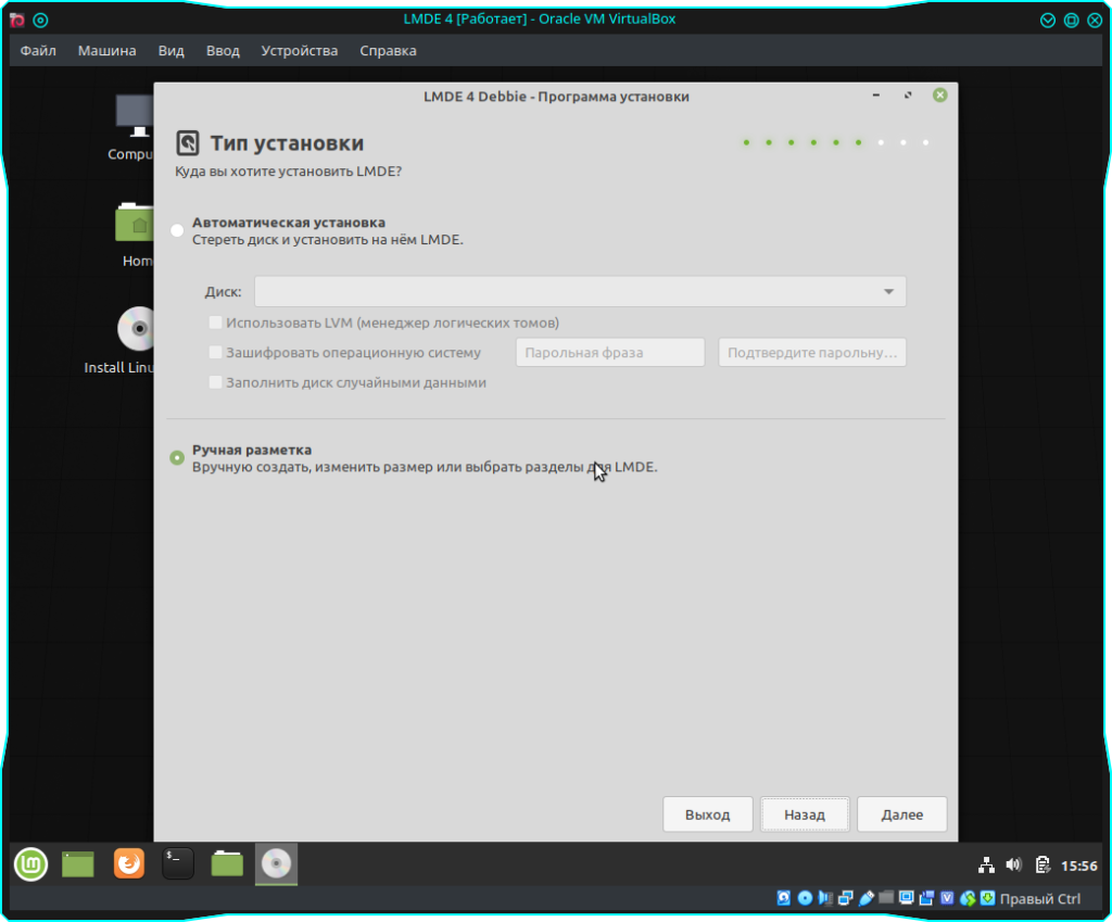 Следующим этапом предстоит разметка диска. На этом этапе вы можете выбрать как автоматическую, так и ручную. Стоит отметить, что при выборе ручной разметки, система автоматически предлагает вам один из вариантов, собственно, его мы и возьмем за основу. Лишь слегка подредактируем. А именно, создадим раздел “home”.