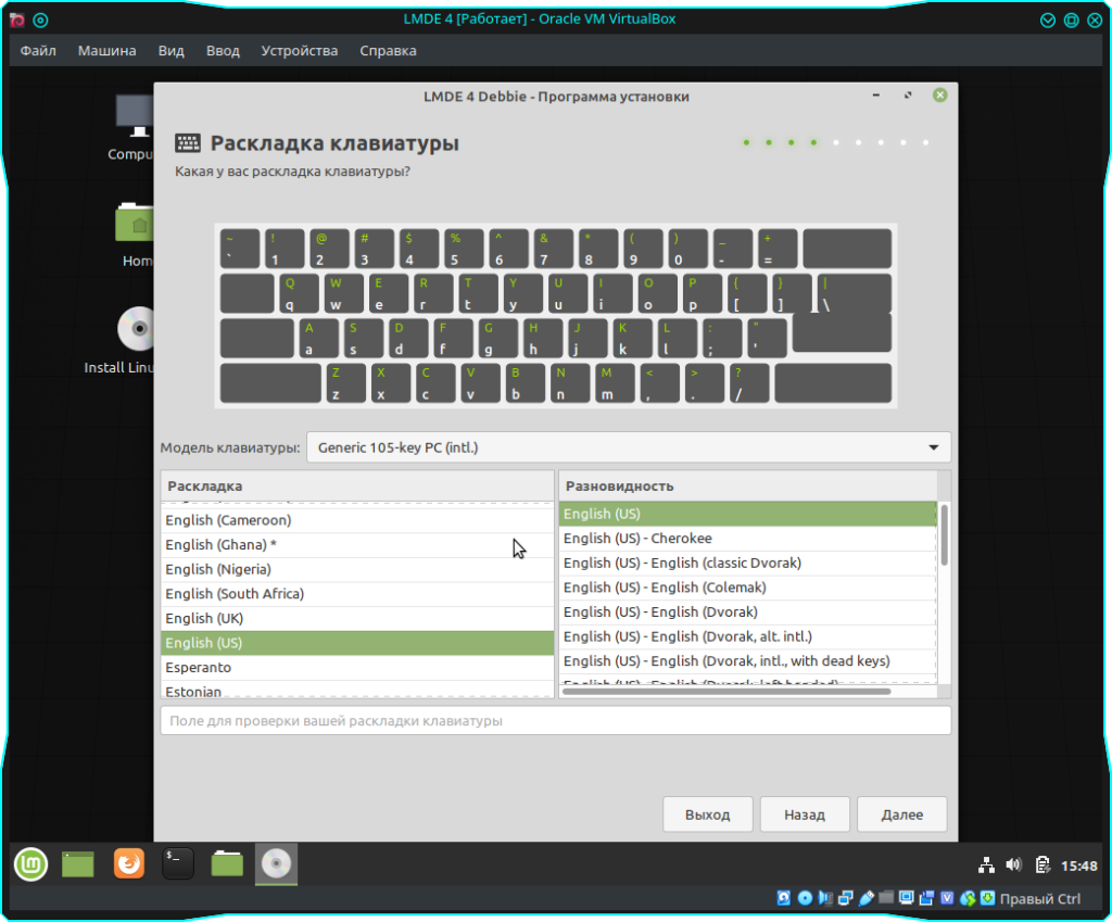 После чего нужно выбрать раскладку клавиатуры. На данном этапе рекомендую выбрать Английскую “English US”. После чего нажимаем кнопку “Далее” и продолжаем установку: