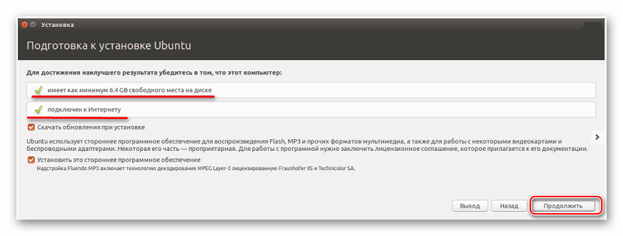 В следующем окне отобразится оценка свободного места на диске и есть ли подключение к Интернету. Можно также отметить скачивание обновлений и установку программного обеспечения, но это можно сделать и после установки Ubuntu. Нажмите «Продолжить».