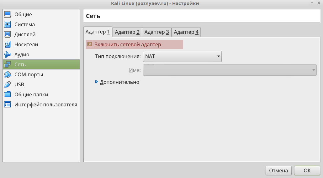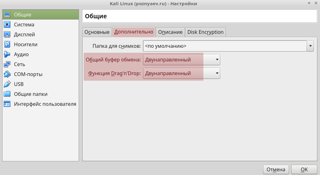 На вкладке «Дополнительно» раздела «Общие» укажите следующие параметры, необходимые для обмена данными между вашей основной операционной системой и Kali Linux: