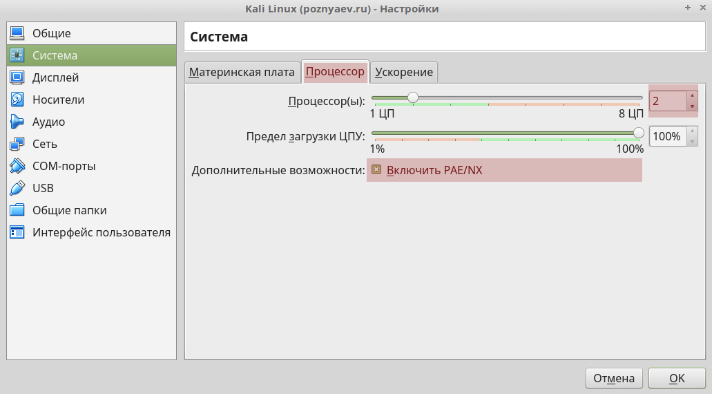 - Выделите виртуальной машине не менее двух ядер центрального процессора.