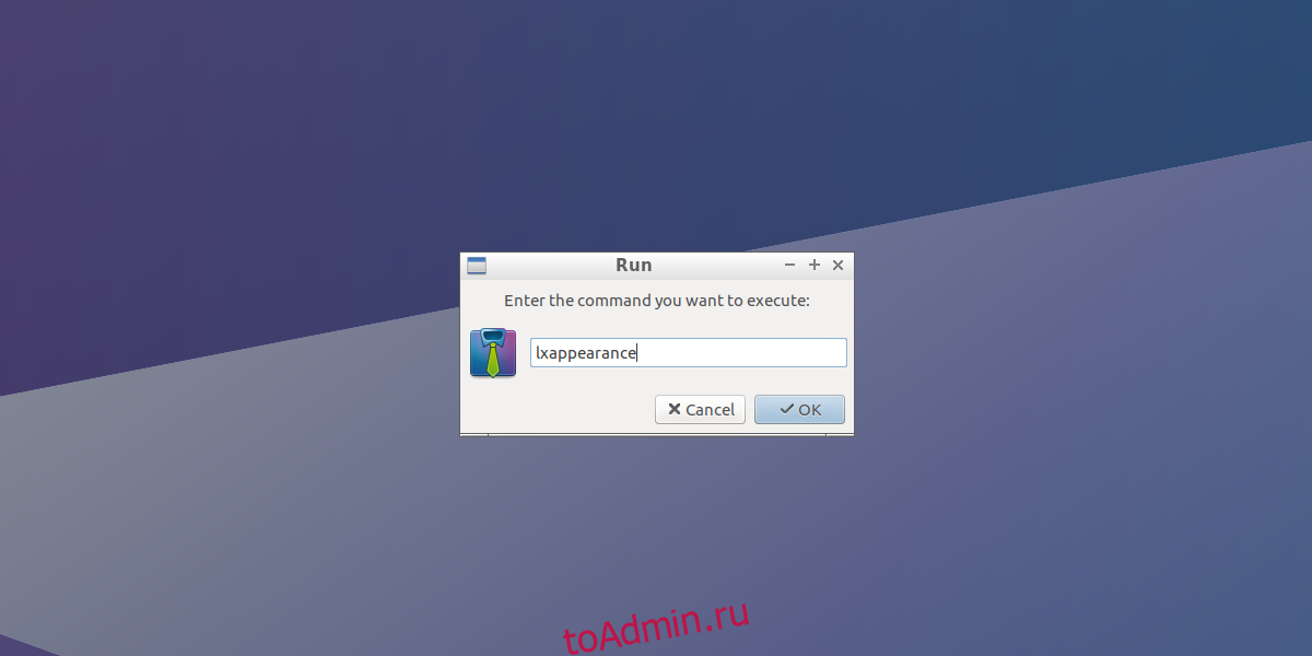 Чтобы изменить тему GTK2 по умолчанию на рабочем столе LXDE, вам нужно открыть LXAppearance. Есть два способа открыть это приложение, но самый быстрый способ запустить это приложение — открыть его с помощью средства запуска. Нажмите ALT + F2, введите «lxappearance» и нажмите клавишу ввода.