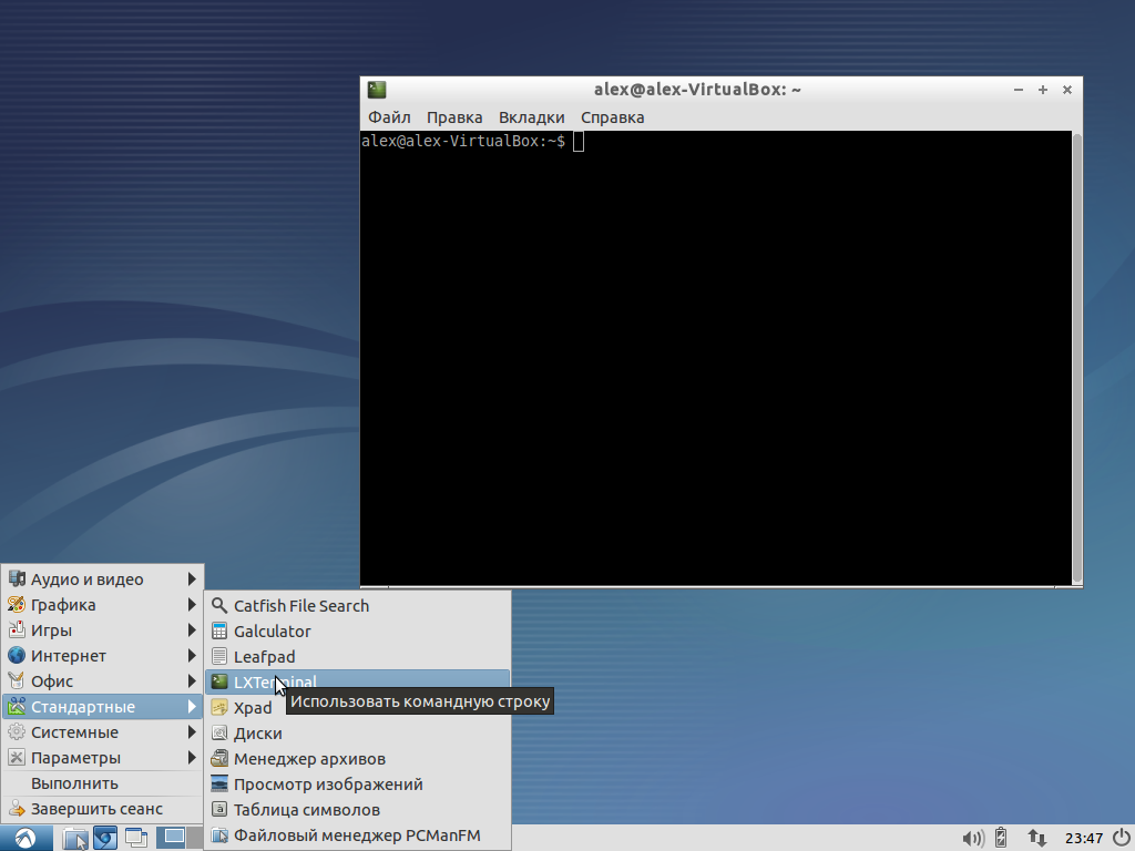 Снова войдите в систему и запустите lxterminal (Меню→Стандартные→Lxterminal).