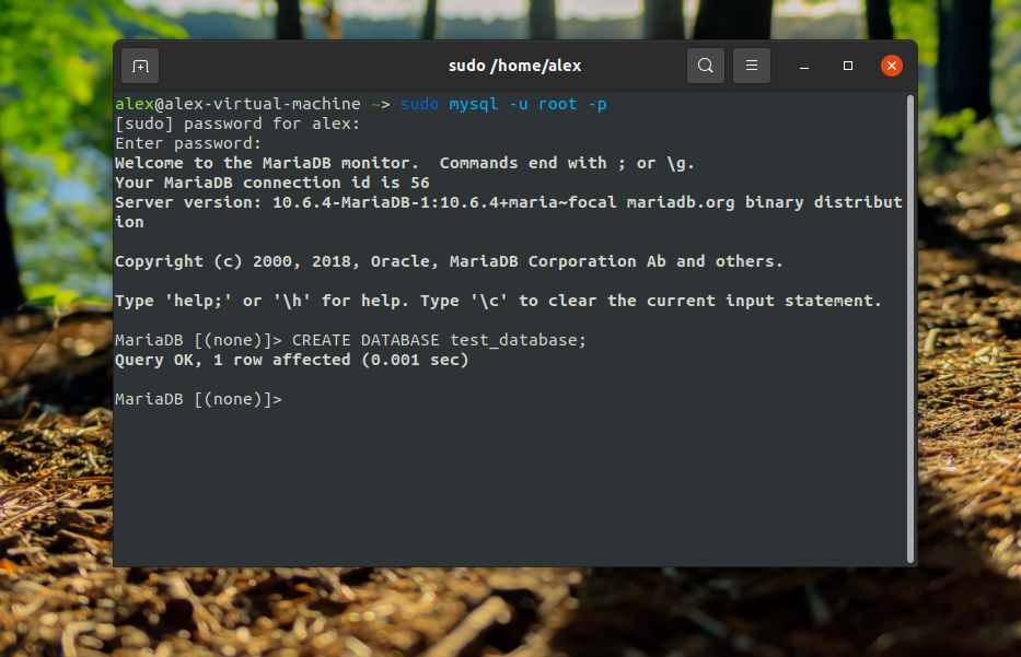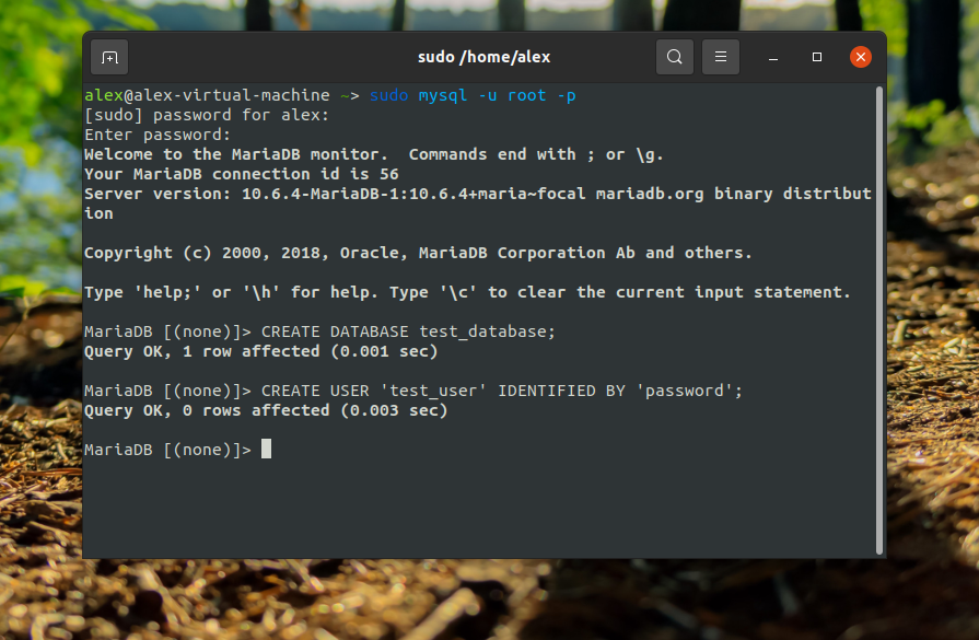 To do so, we will be creating a new account called with the same capabilities as the root account, but configured for password authentication. To do this, open up the MariaDB prompt from your terminal:
