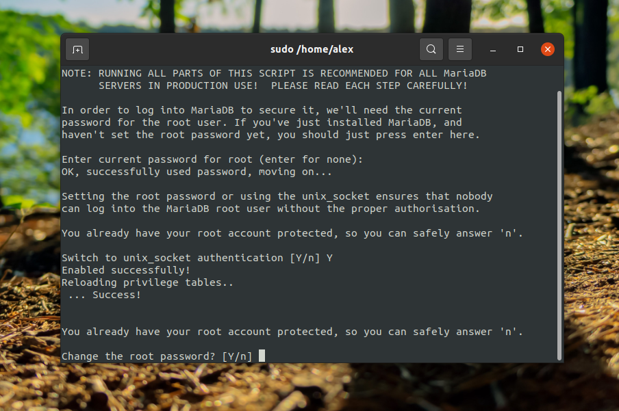 Далее при появлении фразы Switch to unix_socket authentication [Y/n], введите y, для переключения авторизации на Unix сокеты и нажмите клавишу Enter.