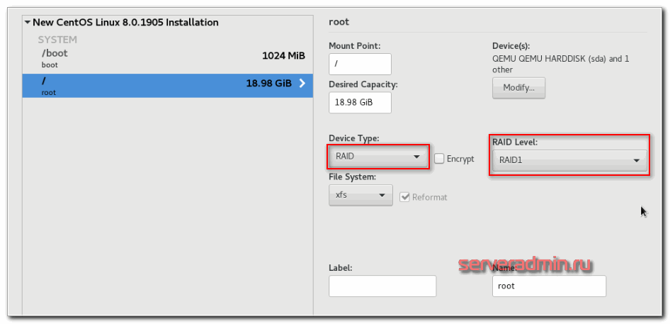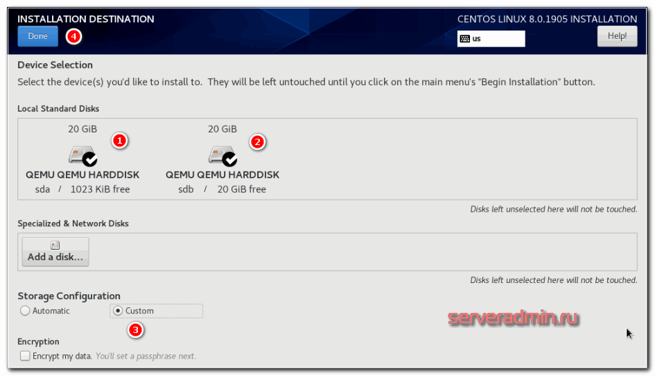 Рассмотрим еще один, более специфичный вариант установки. Он может быть актуален, когда вы настраиваете, к примеру, железный сервер для работы на нем гипервизора KVM, либо отдельной ноды кластера Kubernetes, на которой будет использоваться локальное файловое хранилище. Мы будем ставить CentOS 8 на программный рейд. Для примера возьмем 2 диска и raid 1. Все установки будут такие же, как мы рассмотрели ранее, кроме одной — Installation Destination.