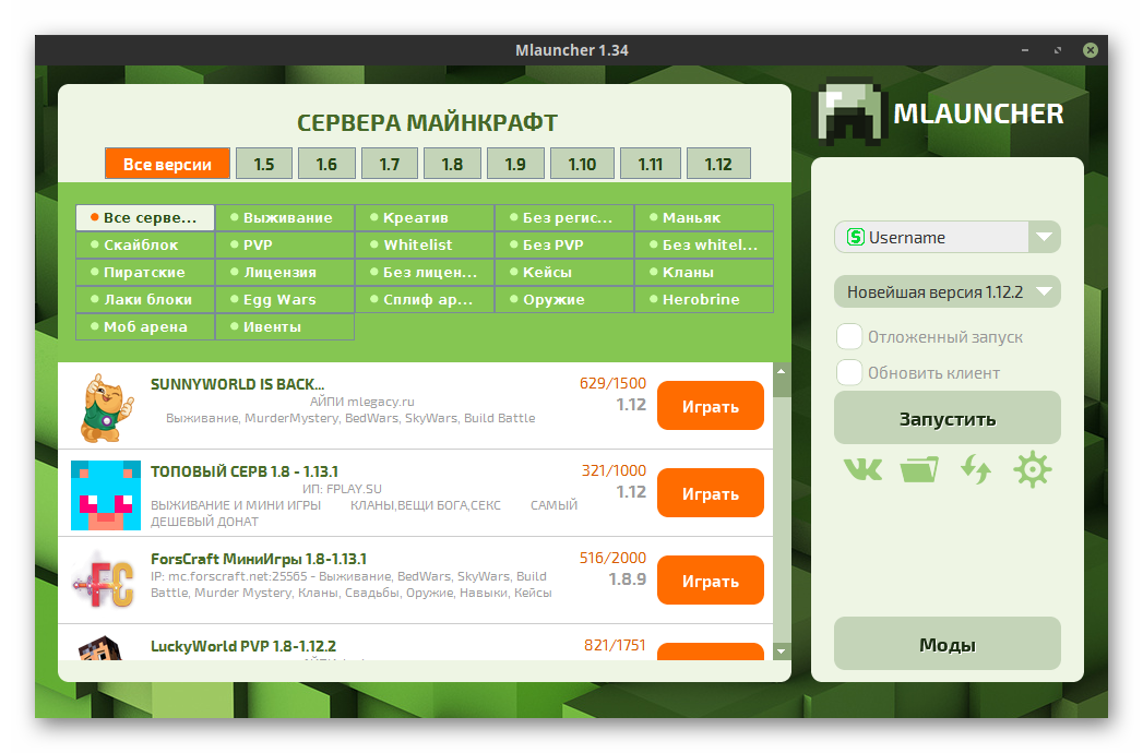- Возможность заходить на сервер в один клик, нажав кнопку «Играть.