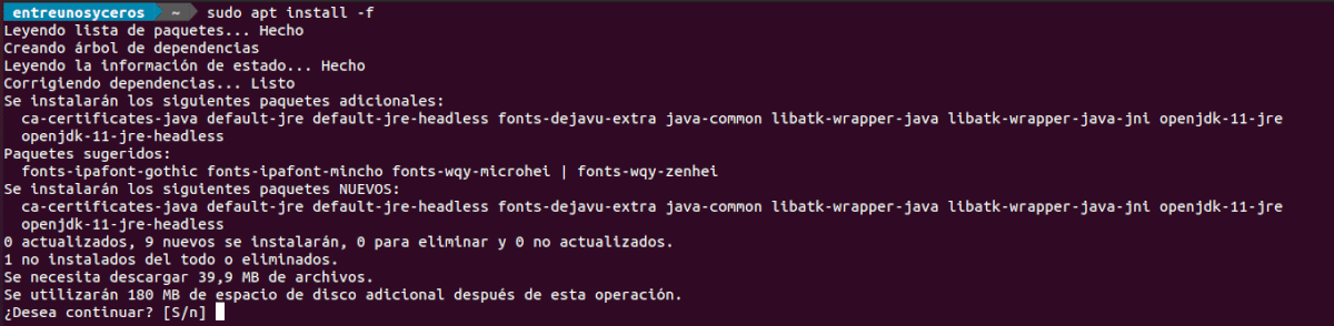 Когда мы установим этот пакет, мы можем встретиться некоторые сообщения об ошибках в терминале о зависимостях. Чтобы решить эти проблемы, нам нужно будет выполнить только эту другую команду в том же терминале: