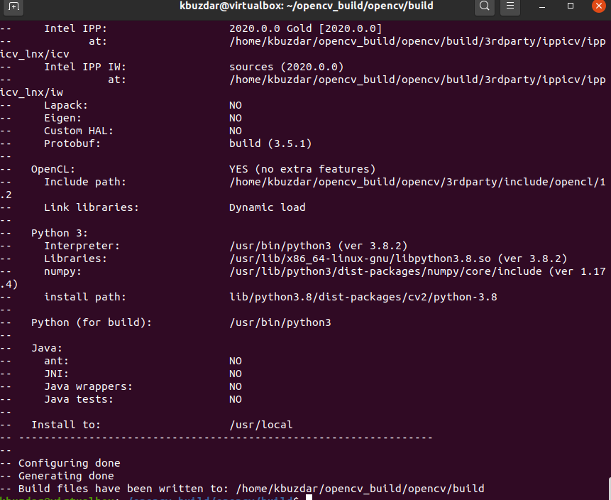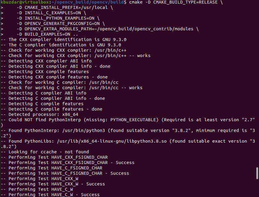 $ cmake -D CMAKE_BUILD_TYPE=RELEASE \ -D CMAKE_INSTALL_PREFIX=/usr/local \ -D INSTALL_C_EXAMPLES=ON \ -D INSTALL_PYTHON_EXAMPLES=ON \ -D OPENCV_GENERATE_PKGCONFIG=ON \ -D OPENCV_EXTRA_MODULES_PATH=~/opencv_build/opencv_contrib/modules \ -D BUILD_EXAMPLES=ON ..