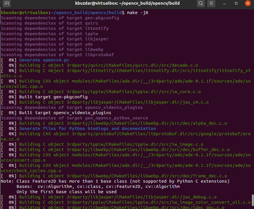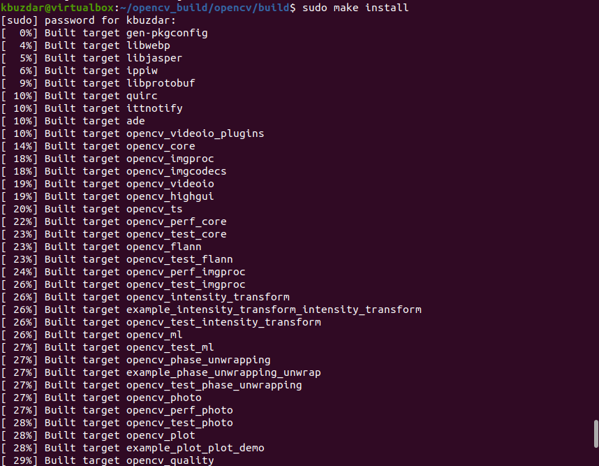 # find out number of CPU cores in your machine nproc # substitute 4 by output of nproc make -j4 sudo make install sudo sh -c 'echo "/usr/local/lib" >> /etc/ld.so.conf.d/opencv.conf' sudo ldconfig