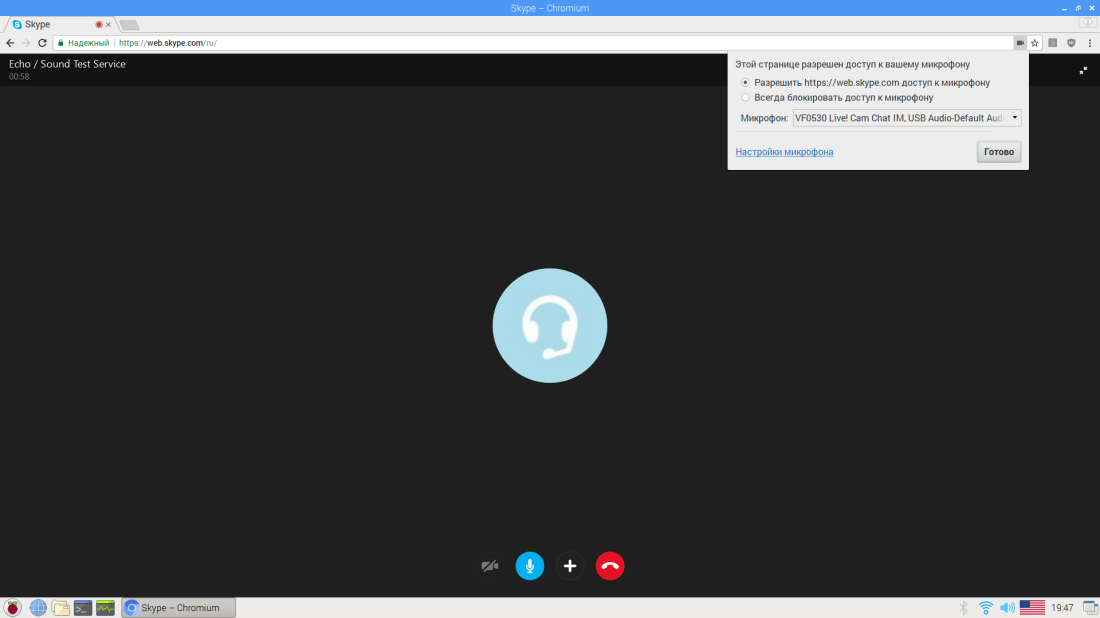 Откроем Skype. Через Chromium заходим по адресу web.skype.com/ru и выполняем вход в свой аккаунт. Затем нажимаем на зелёный замок в адресной строке: разрешаем камеру, микрофон и Flash. Микрофон работать всё равно не хотел. Оказалось, что нужно было кликнуть по значку видеокамеры (в адресной строке справа), затем вместо по «По умолчанию» выбрать правильное аудиоустройство.