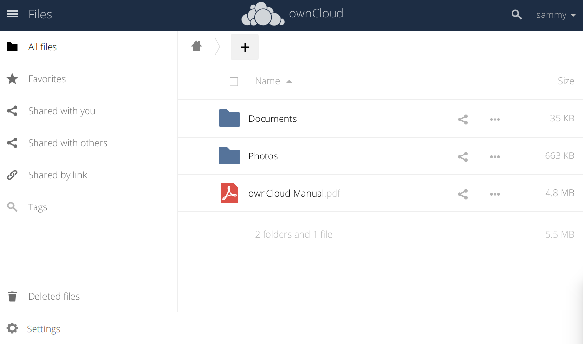 Click Finish setup. When the install completes, the ownCloud login page appears. Login with the newly-created admin credentials. Once logged in, you are taken to the main ownCloud page.