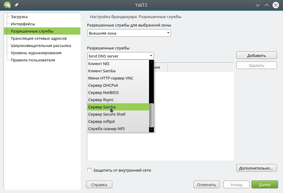 OpenSUSE гораздо более безопасная система, чем другие дистрибутивы. По умолчанию в системе поставляется неплохой брандмауэр, который надежно защищает систему. Но это также требует больше действий от нового пользователя. Если вы используете Samba для обмена файлами в локальной сети, то нужно добавить ее службу в исключения брандмауэра.