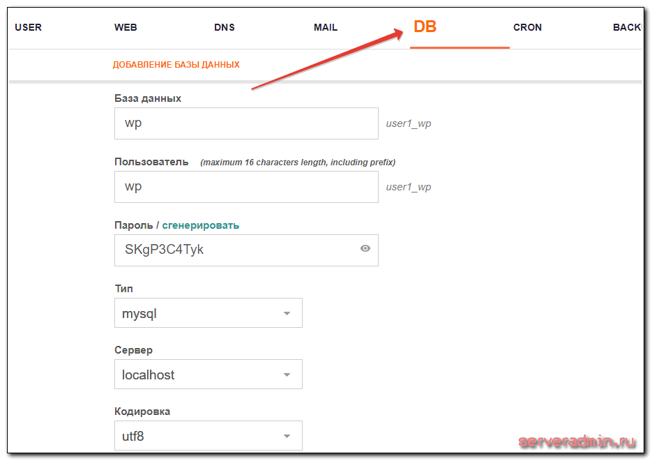 Для сайта нам нужна будет база данных. Создадим ее в соответствующем разделе.