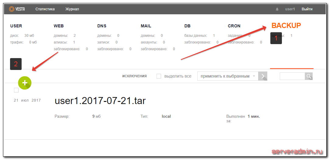 После нажатия на плюс, задание на backup ставится в очередь. Очередь обрабатывается отдельным заданием в кроне раз в 5 минут. После завершения резервного копирования приходит оповещение на почту. После этого бэкап можно скачать через веб интерфейс весты.