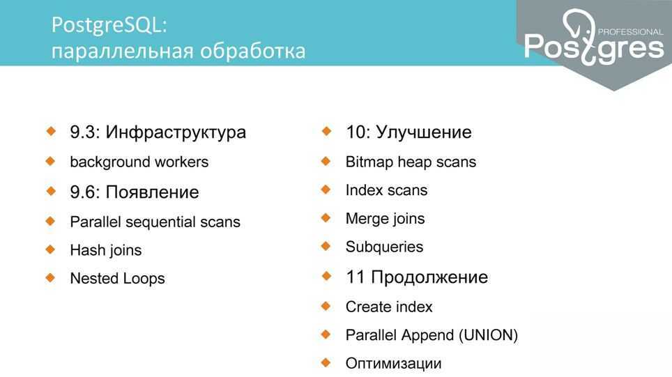 В версии 10 появилось еще больше поддержки параллелизма – Bitmap heap scans, Index scans, Merge joins…