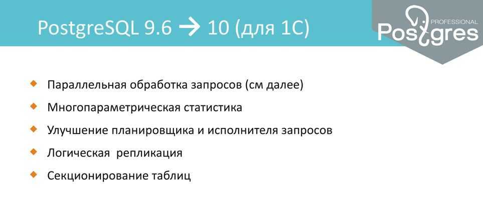 Расскажу немного подробнее про параллельную обработку запросов. В версии 9.3 появились background workers – это «демоны», которые делают задачки в фоновом режиме. В версии 9.6 появились Parallel sequential scans, когда диск читается параллельно сразу несколькими запросами. Т.е. если у вас 1С генерит 10 запросов к одной и той же таблице, то раньше эти все 10 запросов «дрались» за диск, и тогда там очень много overhead. А с параллельной обработкой один процесс читает, а все остальные ждут и пользуются результатами этого «чтения». Это сильно облегчает работу базы данных.