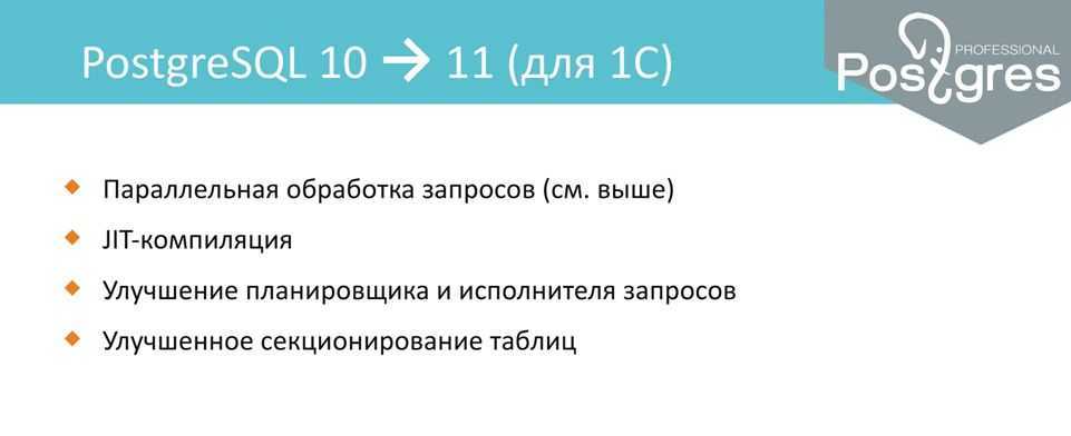 В версии 11 появятся еще более удивительные вещи: улучшилась параллельная обработка запросов, появилась JIT-компиляция — Just-in-time compilation, компиляция «на лету».