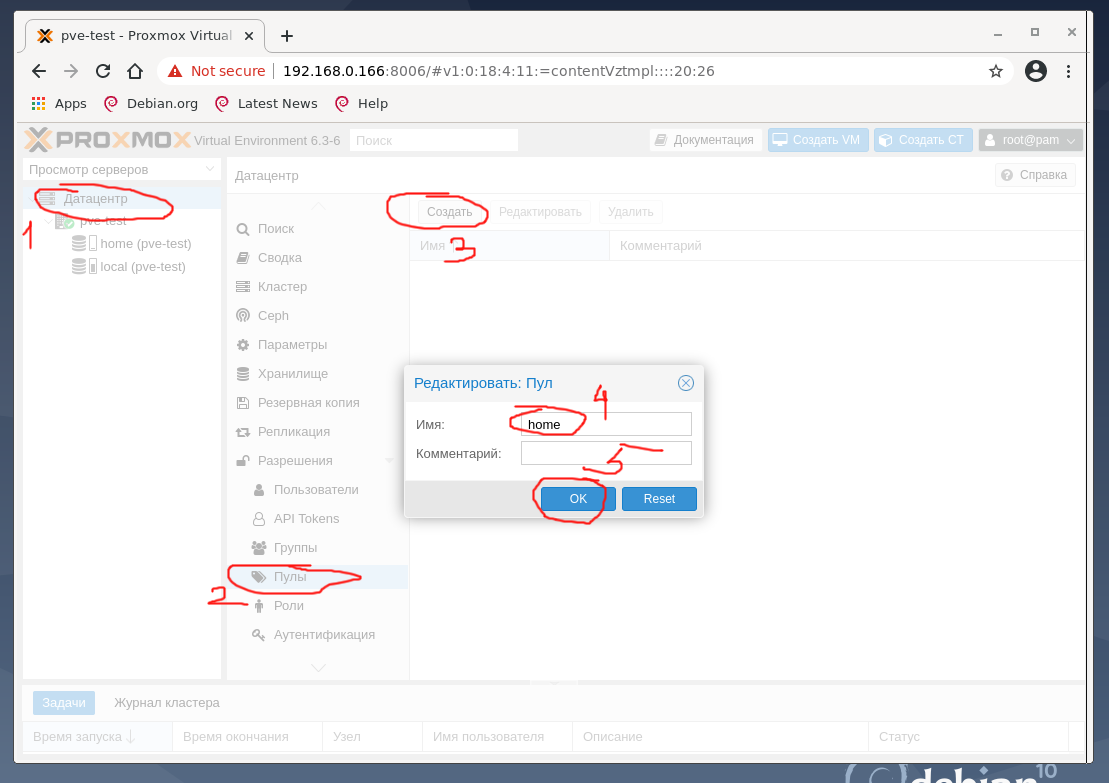 Для создания виртуальных машин необходимо создать Пул ресурсов. Для этого кликните в дереве на вкладку Датацентр, справа выберите пункт Пулы, нажмите Создать, на тестовой машине задано имя пула home, по окончании нажмите ОК: