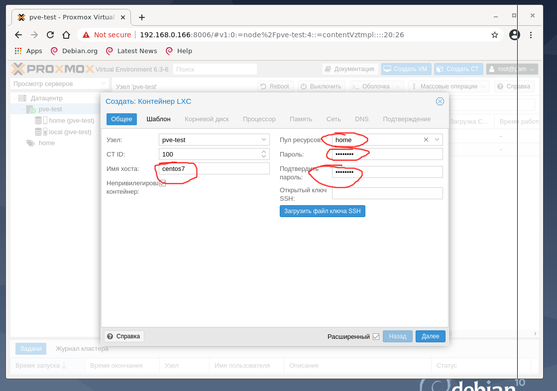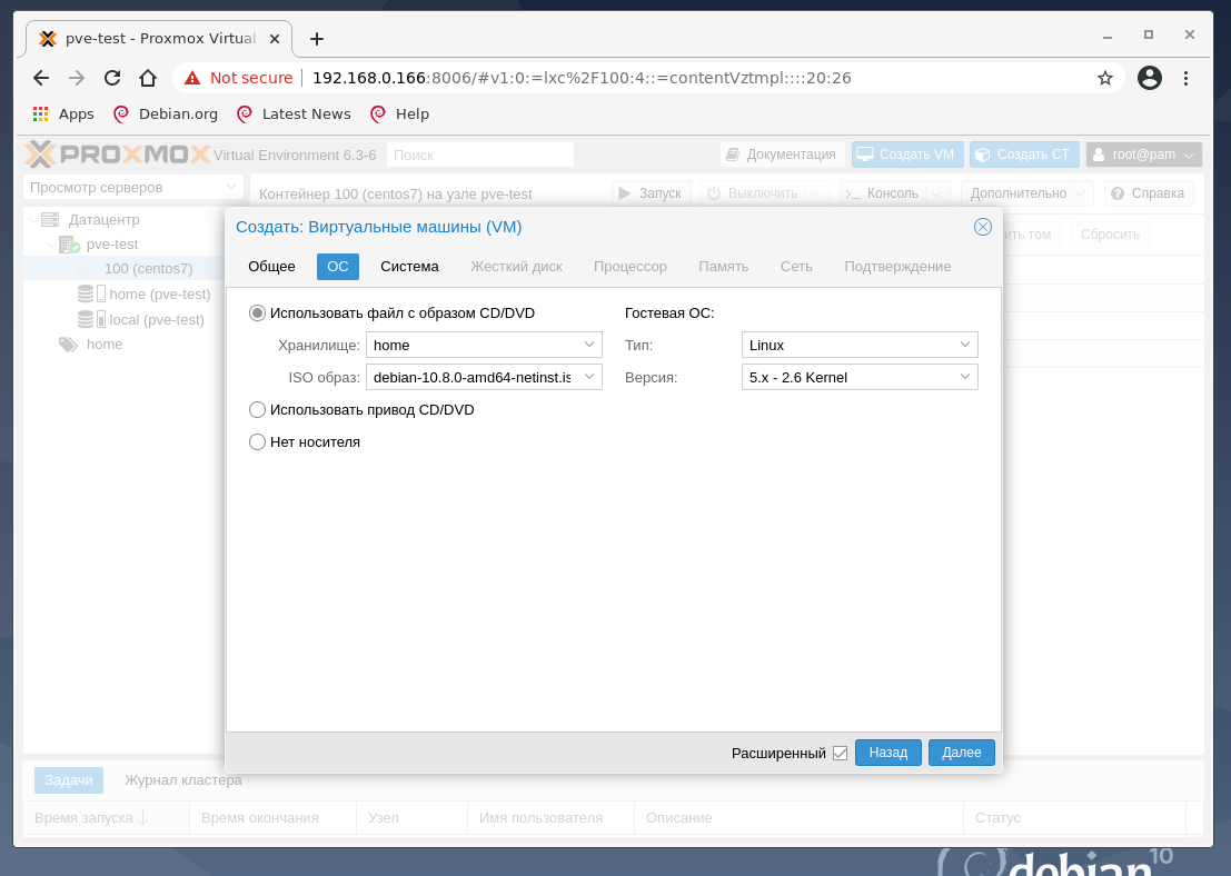 Параллельно можно поставить загрузку дистрибутива debian10 netinstall ISO со своего рабочего компьютера в хранилище home. Для этого выберите в WEB-интерфейсе хранилище home, тип хранения выберите ISO Images и нажмите кнопку Загрузить, в появившемся окне выберите файл образа ISO со своего компьютера и нажмите ОК.