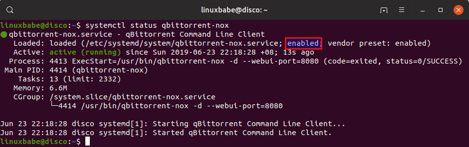 You can see that qBittorrent-nox is running and auto start at boot time is enabled.
