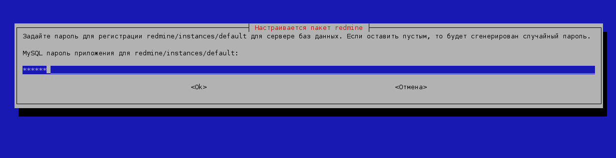 Вводим пароль администратора MySQL и пароль доступа к БД самого Redmine: