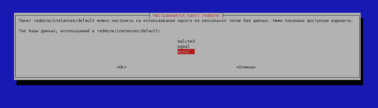 Выбираем с какой СУБД будет работать Redmine: