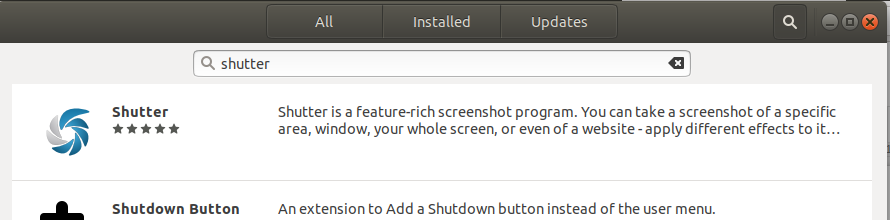 Популярное получение изображения и инструмент редактирования, Затвор, доступны в списке надежной Ubuntu Software для Вас для установки. Это обеспечивает простой способ установить инструмент, с помощью графического интерфейса.