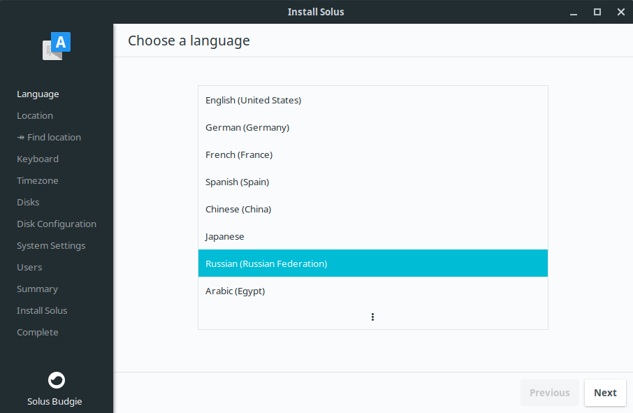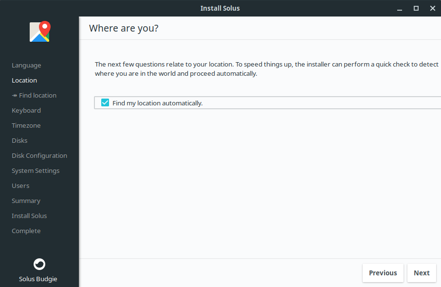 Solus использует свой графический установщик, который начинает с того, что просит выбрать предпочтительный язык из списка. Затем установщик предлагает автоматически определить наше местоположение, чтобы он мог угадать наш часовой пояс и раскладку клавиатуры (в моем случае он правильно угадал мой часовой пояс, но не мою раскладку клавиатуры). При необходимости мы можем переопределить выбор установщика для этих настроек.