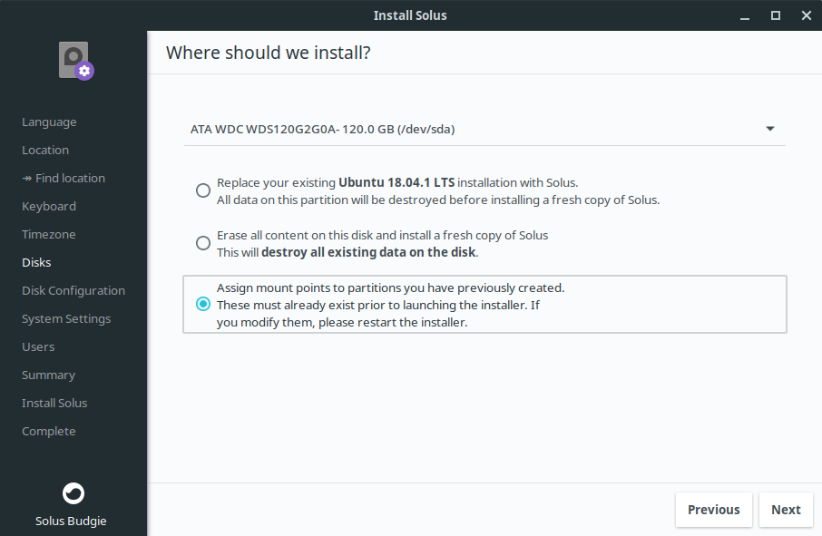 - Erase all content on this disk an install a fresh copy of Solus — очистить все данные на диске и установить Solus. Установщик сам отформатирует диск и создаст необходимые разделы (все данные с диска будут удалены!).